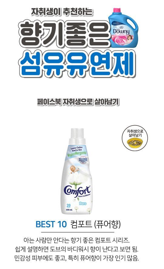 컴포트는 부드러움과 함께 향기까지 챙길 수 있는 제품입니다. 특히, 'BEST 10'으로 선정된 'Pure' 향은 민감한 피부를 가진 분들에게도 적합한 제품입니다. 이 제품은 알레르기 유발 성분이 적어 안심하고 사용할 수 있습니다.