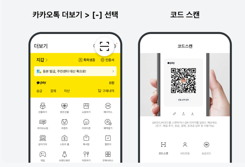 - 카카오페이 메뉴로 이동하기 : 카카오톡에서 '더보기' 메뉴를 클릭한 후, '카카오페이'를 선택합니다.
